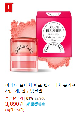 현재 별점 4.5점, 리뷰 1938개를 가진 아케이 볼터치 퍼프 컬러 터치 블러셔 4g, 살구빛코랄, 1개! 지금 쿠팡에서 더 저렴하고 다양한 블러셔 제품들을 확인해보세요.
