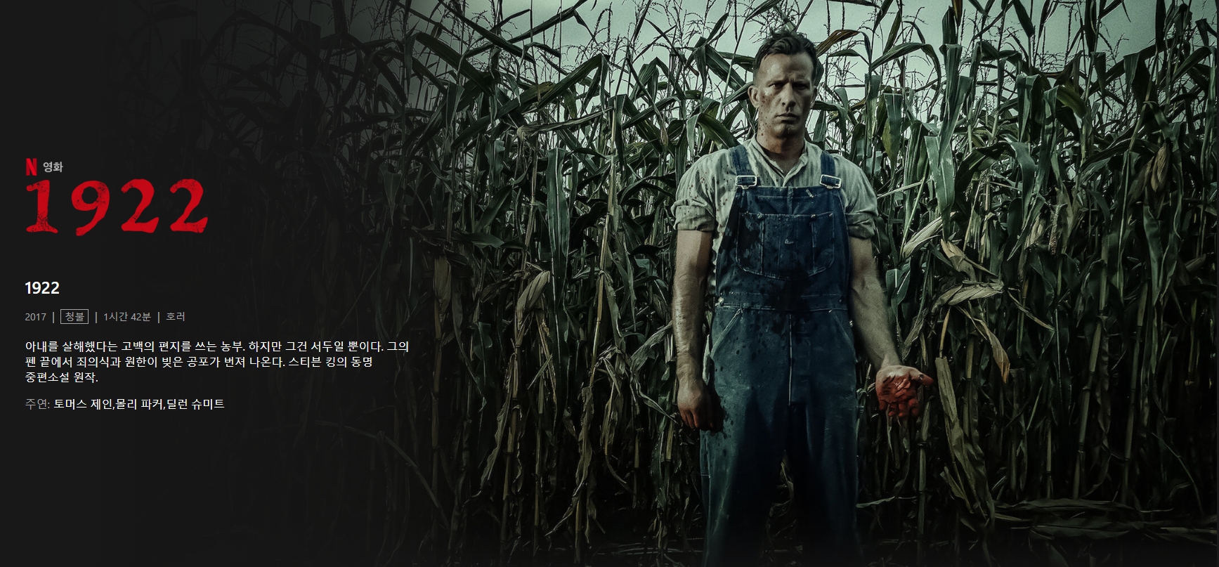 영화 1922은 스티븐 킹의 동명의 소설을 원작으로 한 미스터리 스릴러 영화입니다. 이 영화는 1920년대 미국의 시골에서 벌어지는 끔찍한 사건을 그린 것으로, 시대적 배경과 어둡고 음산한 분위기가 잘 전달되었습니다.