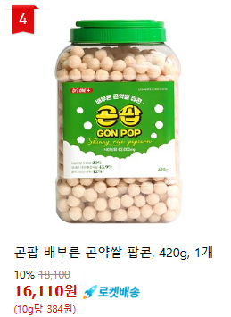 현재 별점 4.4점, 리뷰 5233개를 가진 곤팝 배부른 곤약쌀 팝콘, 420g, 1개! 지금 쿠팡에서 더 저렴하고 다양한 팝콘 제품들을 확인해보세요.