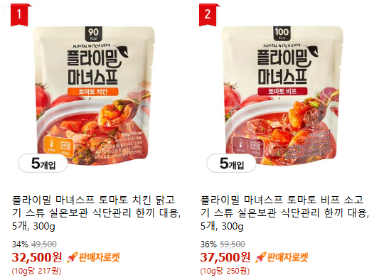 이 스프는 저칼로리로 설계되었으며, 토마토 치킨과 토마토 비프 두 가지 맛으로 제공됩니다.